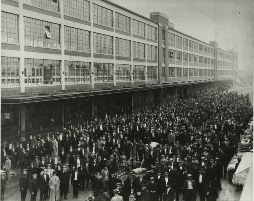 Two institutional details are often missed. First, the $5 was not a simple flat wage: it comprised a base rate of $2.34 plus a “profit-sharing” supplement, conditional on meeting standards of conduct, sobriety, and household management. Second, these conditions were enforced by a newly created Sociological Department that investigated workers’ private lives. The Five-Dollar Day thus combined a higher wage with stronger screening and monitoring.